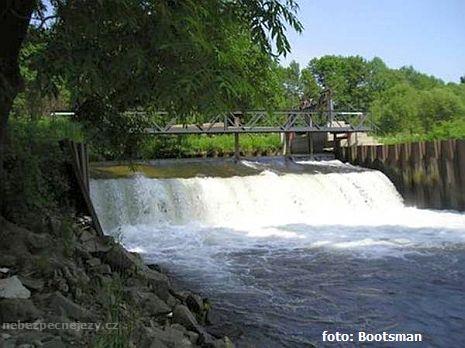 Instalace cedule nad jez upozorňující na nebezpečný jez a šipkou k místu přenášení. Informační cedule k jezu s podkovou a zákazem koupání.