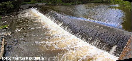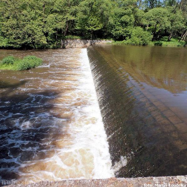 Jez je včas vidět, nelépe je zastavit vlevo u silnice a přenést jej přes lávku nad náhonem. Lodě je nutno přenést po vysoké zdi navigace cca 30m, kde je již možno sejít dolů k řece. přenášení vpravo zabraňuje silně zarostlý břeh.