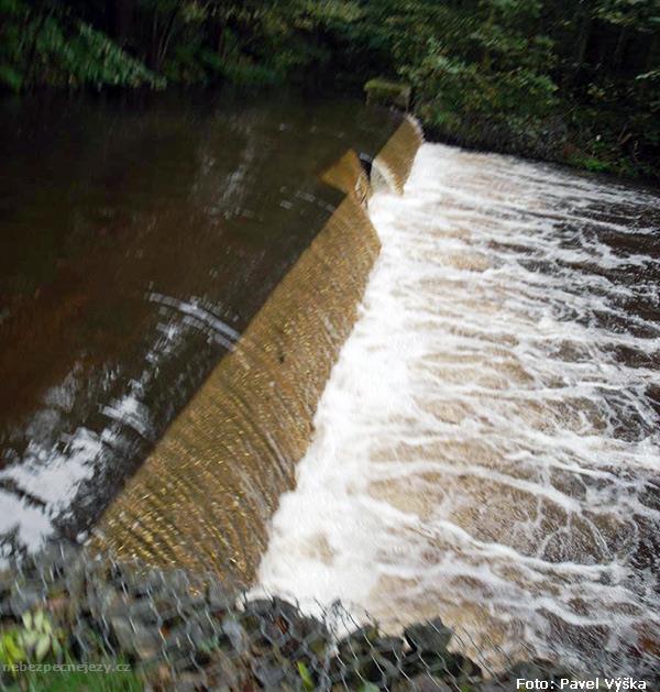 0,8 metru vysoký jez. Už za mírně zvýšených vodních stavů se tvoří dlouhé a silné vývařiště.