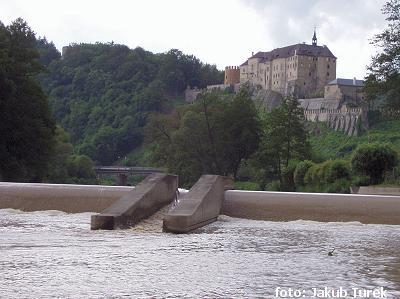 Na pravém břehu je cestička až pod jez. Výstup nad jezem je označen cedulí.
