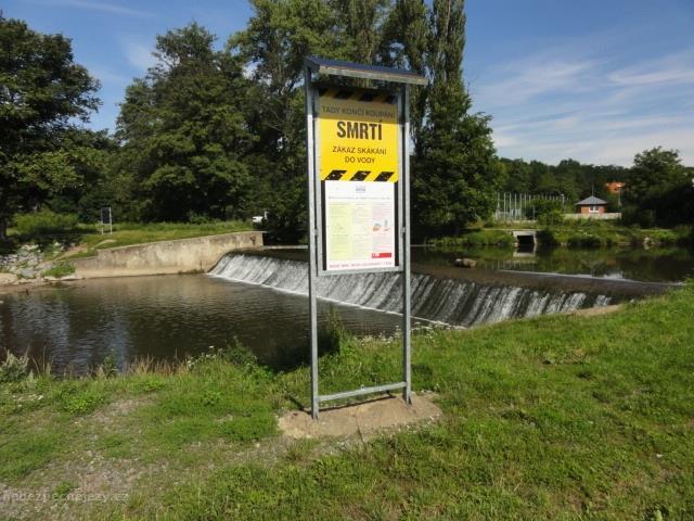 osazeny výstražné a informační cedule na stojanech s házecí podkovou a po 2 sloupcích s vodáckými cedulemi na nataženém lanku před jezem upozorňující na nebezpečný jez.
