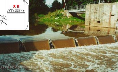 podcenění jezu - když je sklopený, není nebezpečný, ale jinak je zde velký válec.