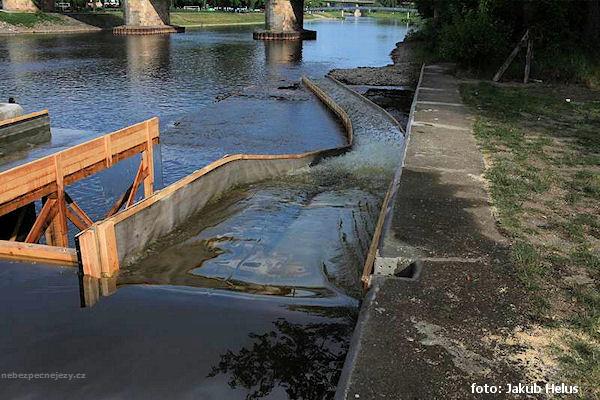 dřevěný skluz pro vodáky u pravého břehu jezu (mezi pravým pilířem jezu a břehem)