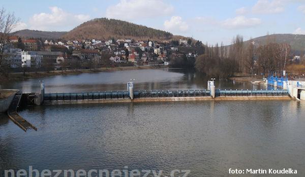 Nově zrekonstruovaný sklápěcí jez, výška 2,5 metru. Za vyšší vody a VV velmi silné vývařiště. Těsně u pravého břehu je v létě otevřený skluz pro vodáky. Za velké vody skluz nepoužívat! U levého břehu je nová MVE a rybí přechod.