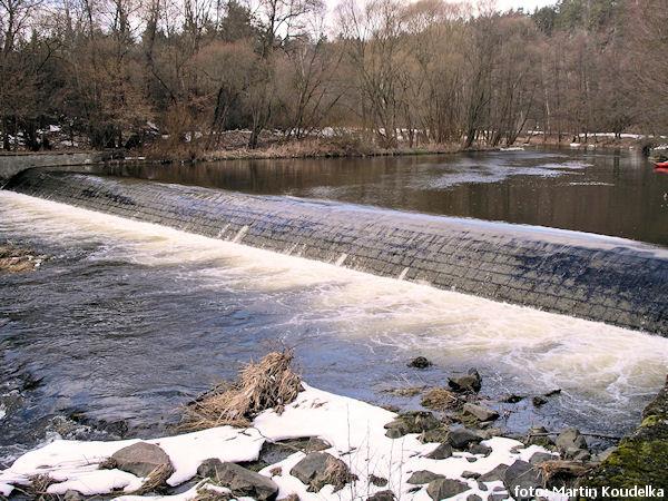 Jez je včas vidět, nelépe je zastavit vlevo u silnice a přenést jej přes lávku nad náhonem. Lodě je nutno přenést po vysoké zdi navigace cca 30m, kde je již možno sejít dolů k řece. přenášení vpravo zabraňuje silně zarostlý břeh.