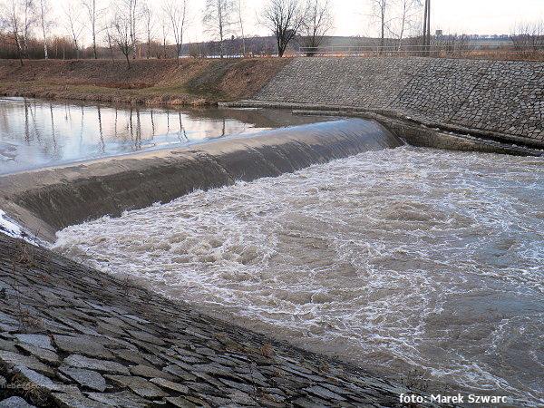 Jeden z nejnebezpečnějších jezů na řece Opavě, s parabolickou spádovou deskou, šikmou navigací, zrádným vývařištěm a velmi úzkou propustí vlevo. Má na svědomí dlouhou řadu životů.