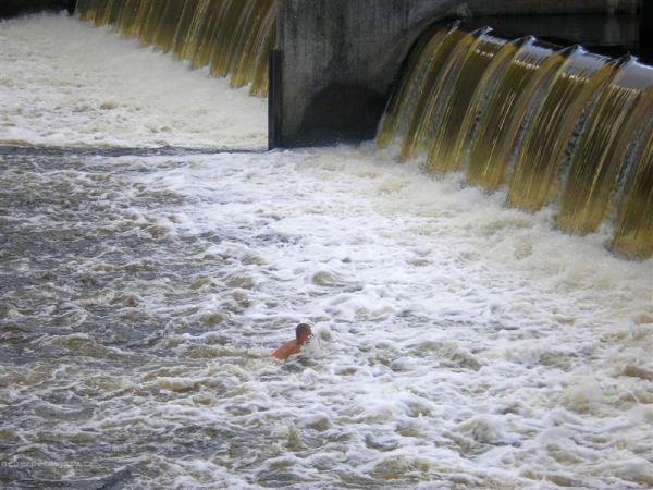 Pod jezem je silné vývařiště a tvoří se silný zpětný proud, který tahá zpátky pod jez, tudíž největší riziko je zde. Při nastupování je potřeba dát velký pozor , a popotáhnout lodě níž po proudu. V sezoně je málo místa pod jezem, jelikož přenáší více skupin najednou. Stojíte li poslední blíže k jezu, začne vám to stahovat loď. Jednořadé schody pod jezem značně komplikují přenášení a je tu riziko pádu. Vzhledem k výšce a vzhledu jezu, málo kdo bude riskovat sjezd.