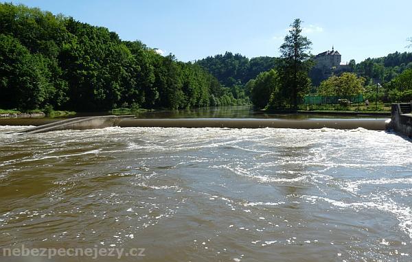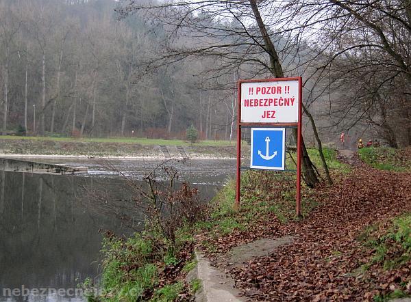 - upozornění na nebezpečný jez cedulí u mostu