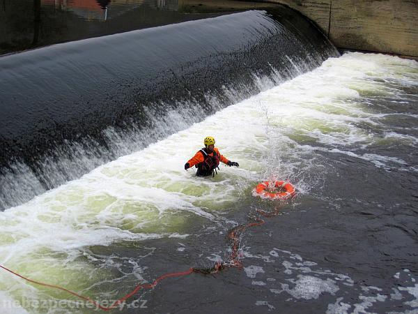 - umístění informační cedule o nebezpečnosti jezu a laické pomoci zároveň se záchrannou podkovou na lanu na oba břehy.