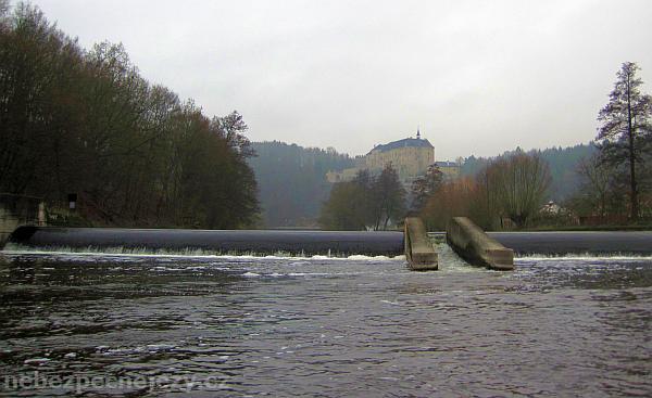 Na pravém břehu je cestička až pod jez. Výstup nad jezem je označen cedulí.