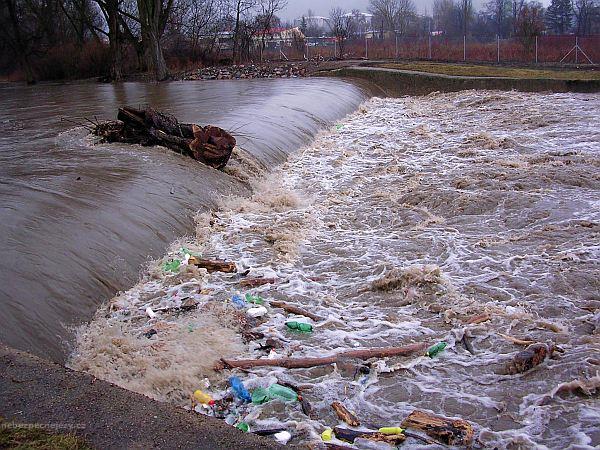 osazeny výstražné a informační cedule na stojanech s házecí podkovou a po 2 sloupcích s vodáckými cedulemi na nataženém lanku před jezem upozorňující na nebezpečný jez.