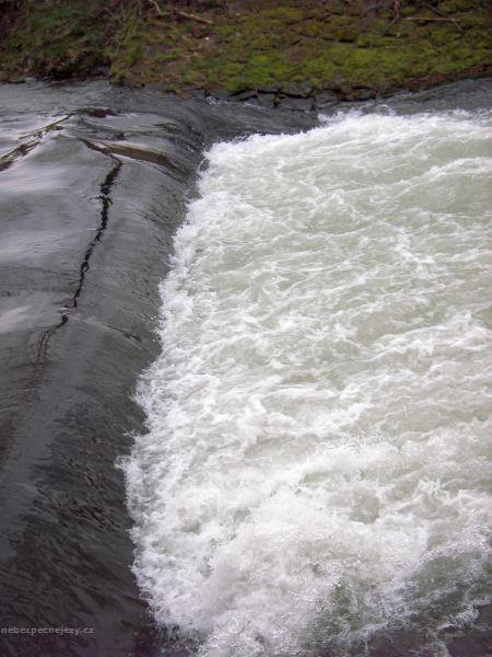 podcenění jezu, těžko se rozeznává z nadjezí (malý rozdíl hladin). Minimálně 2 utonutí.