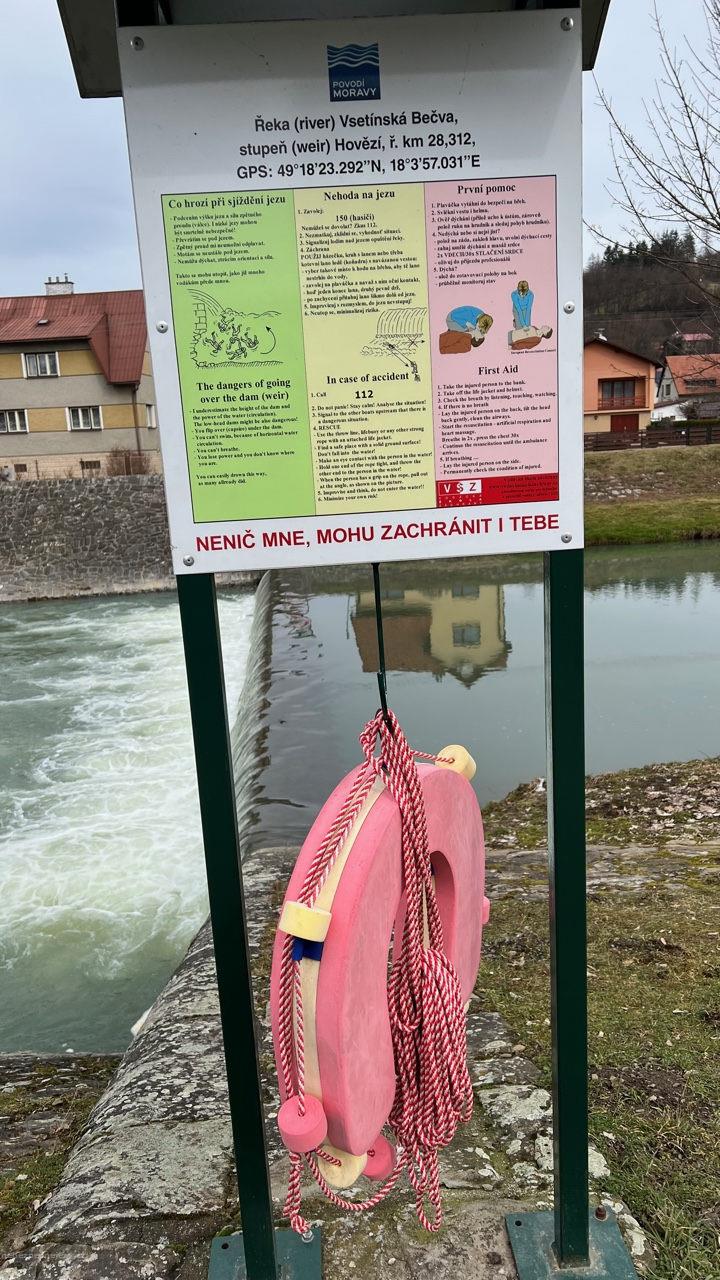 Výstražné cedule umístit tak, aby byly viditelné i z řeky, vyřezat nad jezem keře a označit výstupní místo.