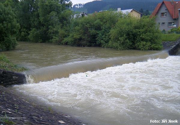 Stromy a keře před jezem znesnadňují zastavení v dostatečné vzdálenosti od jezu.